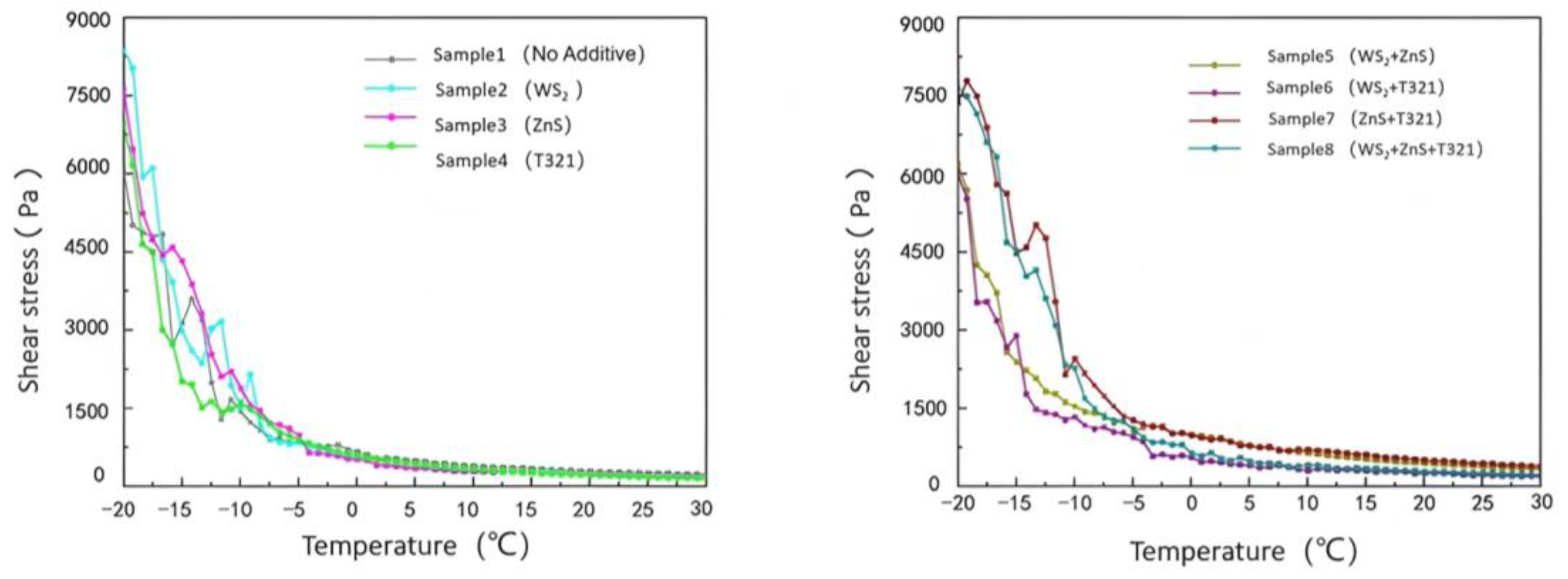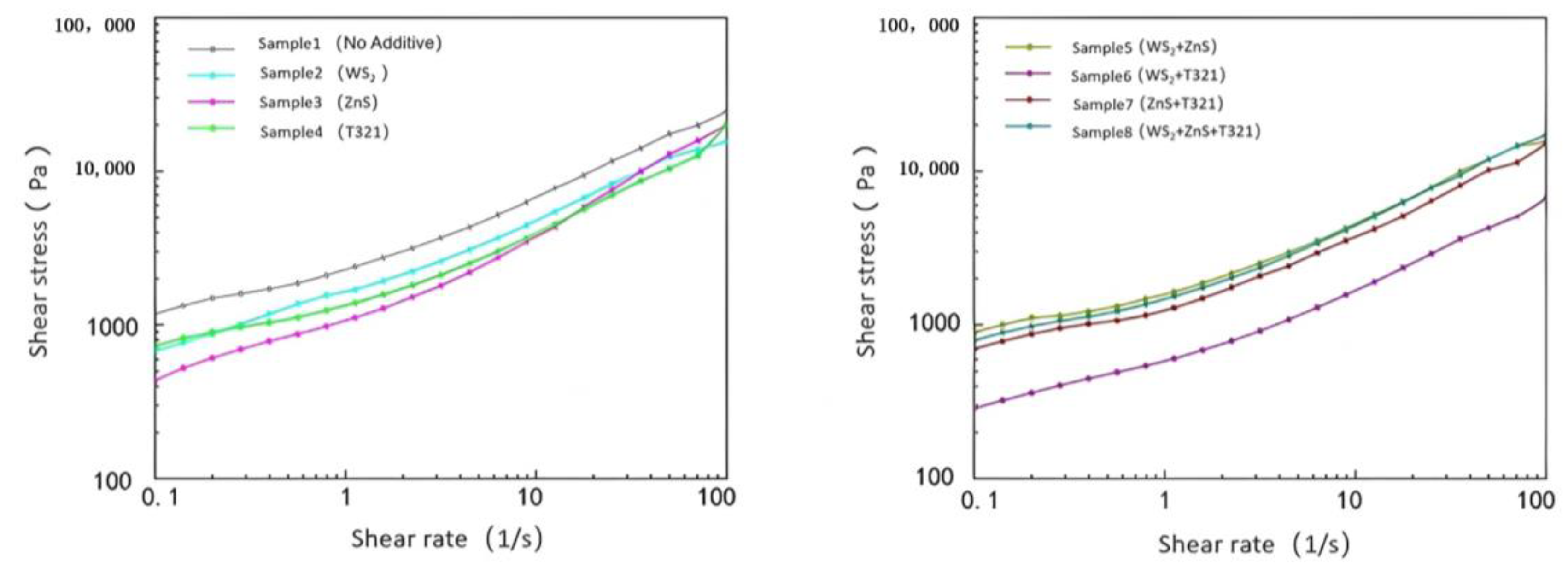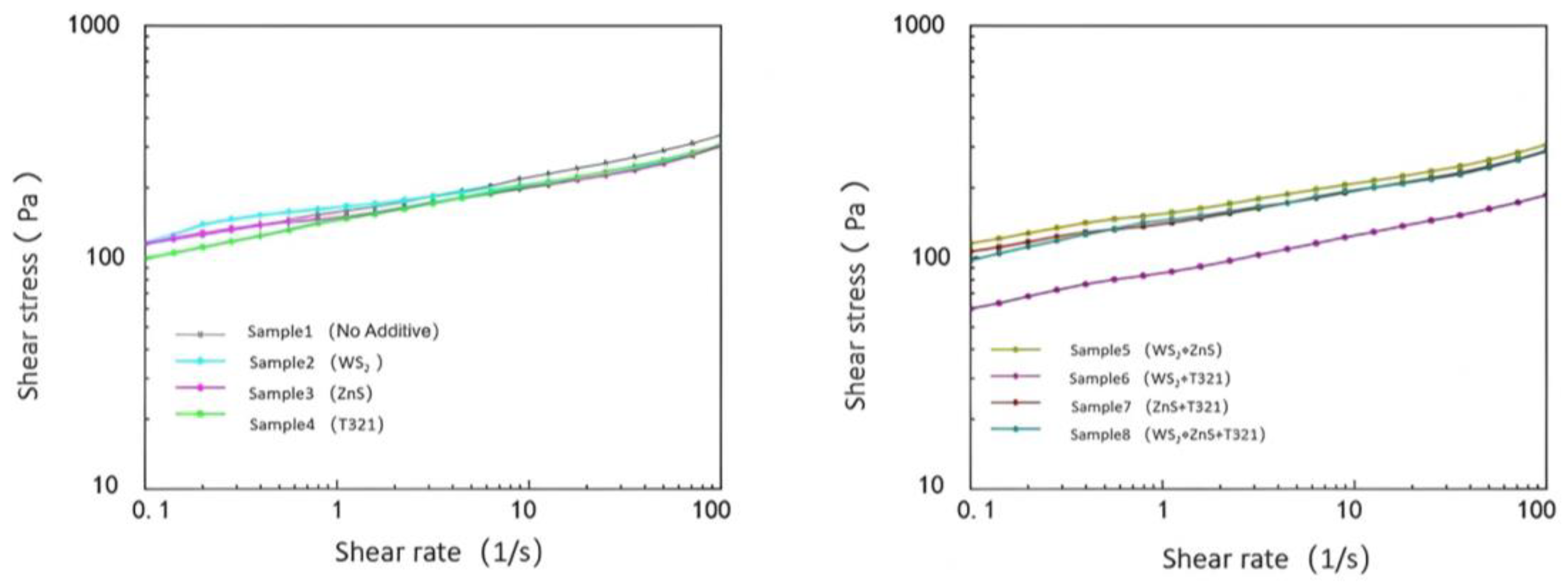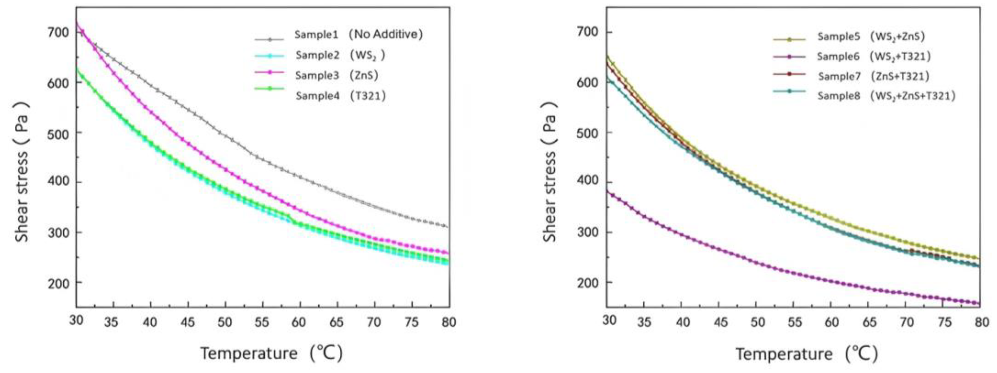- In rheology, the WS2 and T321 blend system exhibits the highest shear stability at 80 °C (with a gradual increase in shear stress) and demonstrates optimal viscosity–temperature characteristics and flow properties across a broad temperature range from −20 °C to 80 °C. This ensures its lubricant performance capability under extreme high and low temperatures. Rheological testing further confirmed that the modified lipids retained the base lipid’s non-Newtonian fluid properties and colloidal stability, demonstrating the fundamental feasibility of additive modification.
