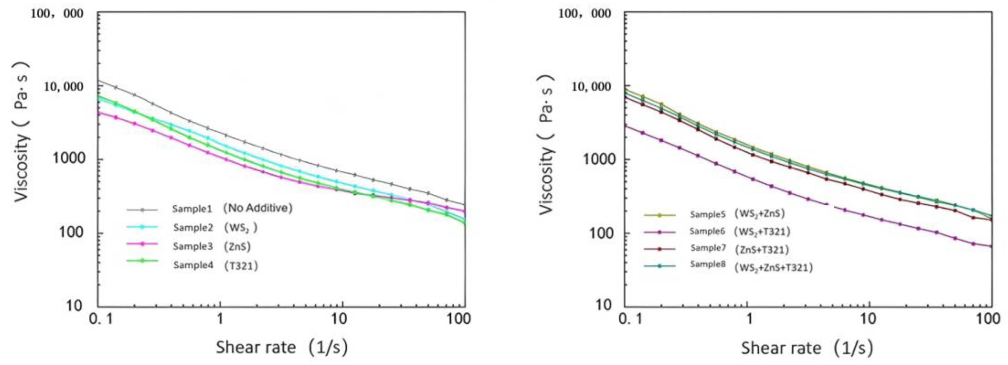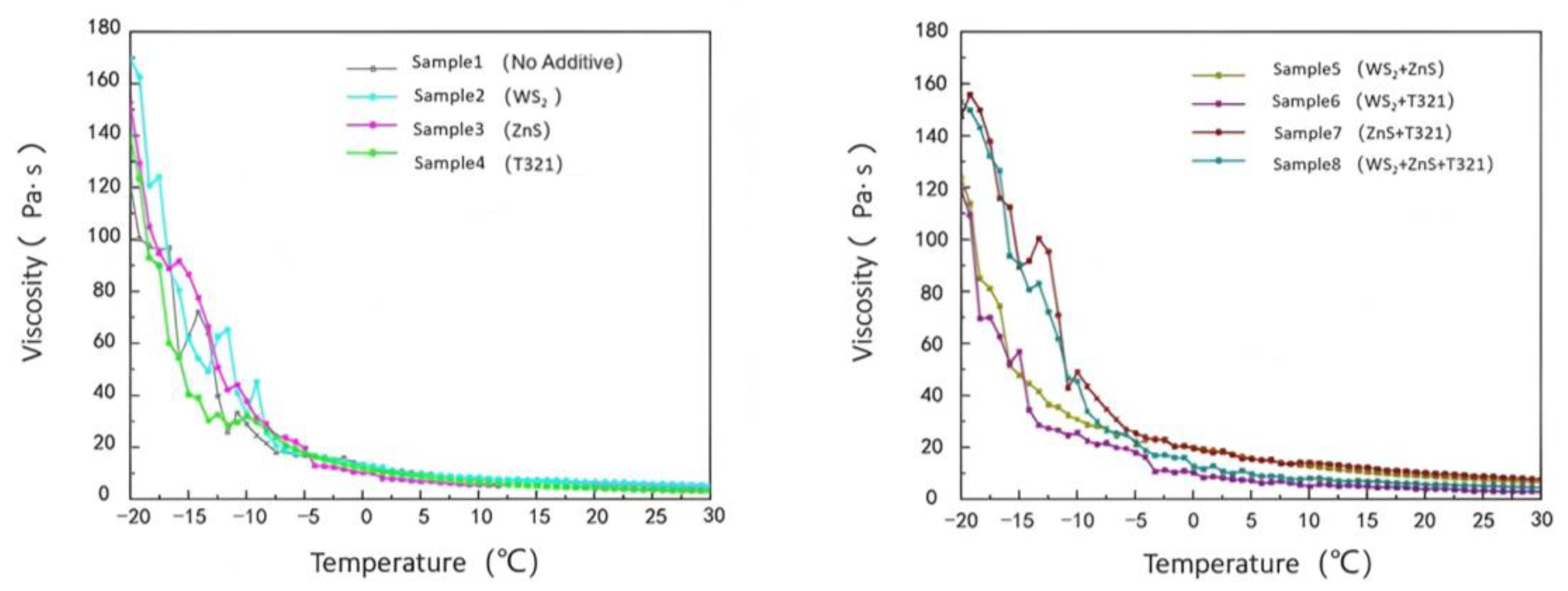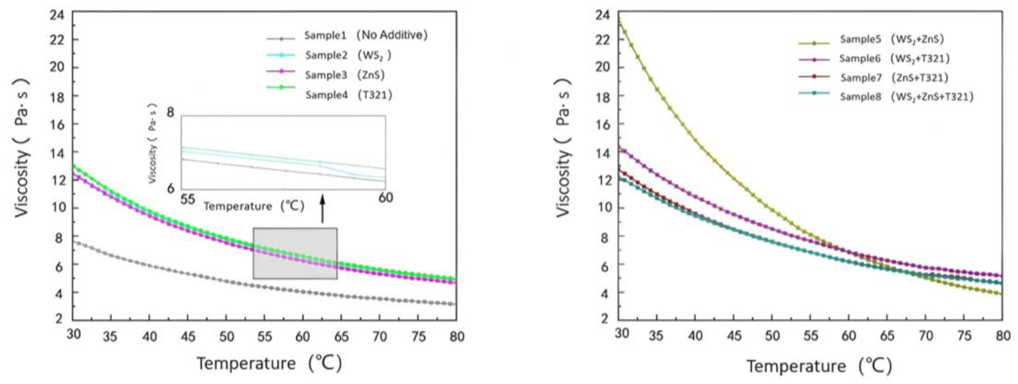 2.2.2. Analysis of Viscosity–Temperature Characteristics for Different Samples