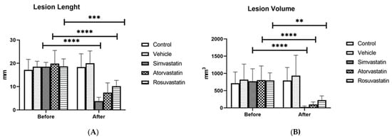 Effects of simvastatin, atorvastatin, rosuvastatin, and vehicle on the length and volume of endometriotic lesions in experimental groups: (A) comparison of lesion length; (B) comparison of lesion volume. Before: before treatment, After: after treatment. ** p < 0.01, *** p < 0.001, **** p < 0.0001.