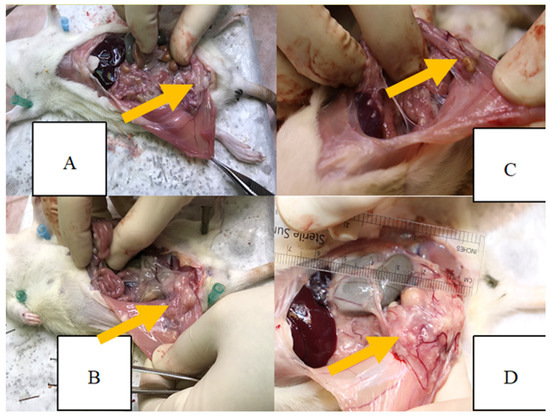 After 21 days, a second laparotomy was performed for macroscopic assessment and biopsy of endometriotic lesions. Endometriotic lesions were located and quantified in three dimensions (length, width, and height in millimeters) with a caliper. The volume of each lesion was calculated using the prolate ellipsoid formula V (mm3) = 0.52 × width × length × height. Digital photographs of the lesions were taken, and all measurements were documented [15].