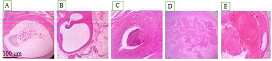 Pathological views of ectopic endometriosis in the experimental groups: (A) post-induction of endometriosis; (B) chitosan-treated control group; (C) rosuvastatin-treated group; (D) simvastatin-treated group; (E) atorvastatin-treated group.