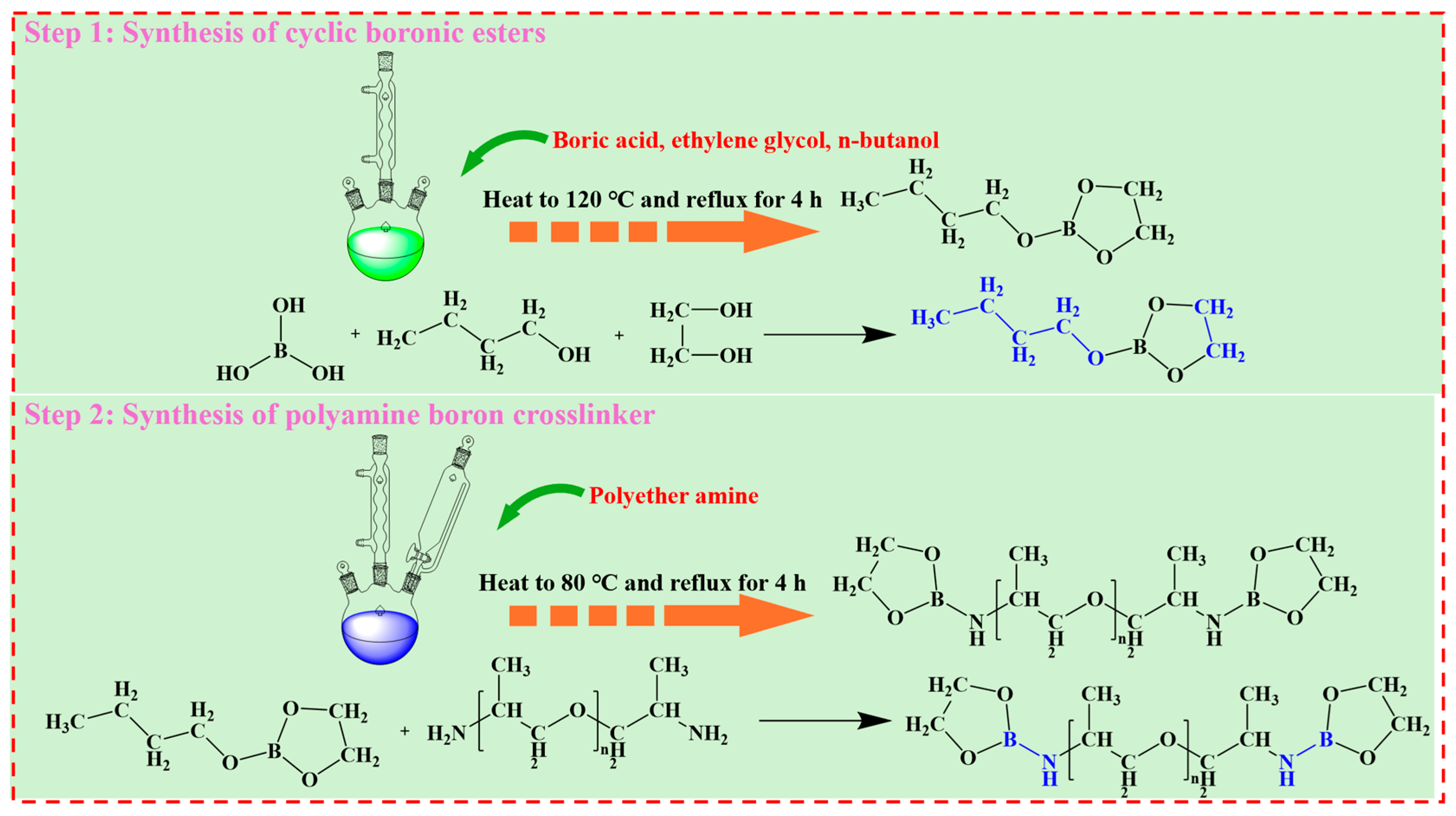 - Qin, F.; Zhang, B.; Wang, Z.; Xu, D.; Zhu, W.; Lu, C. Synthesis and performance evaluation of organic boron crosslinking agent BOA for low concentration guar gum fracturing fluid. J. Xi’an Shiyou Univ. 2024, 39, 70–78. [Google Scholar]