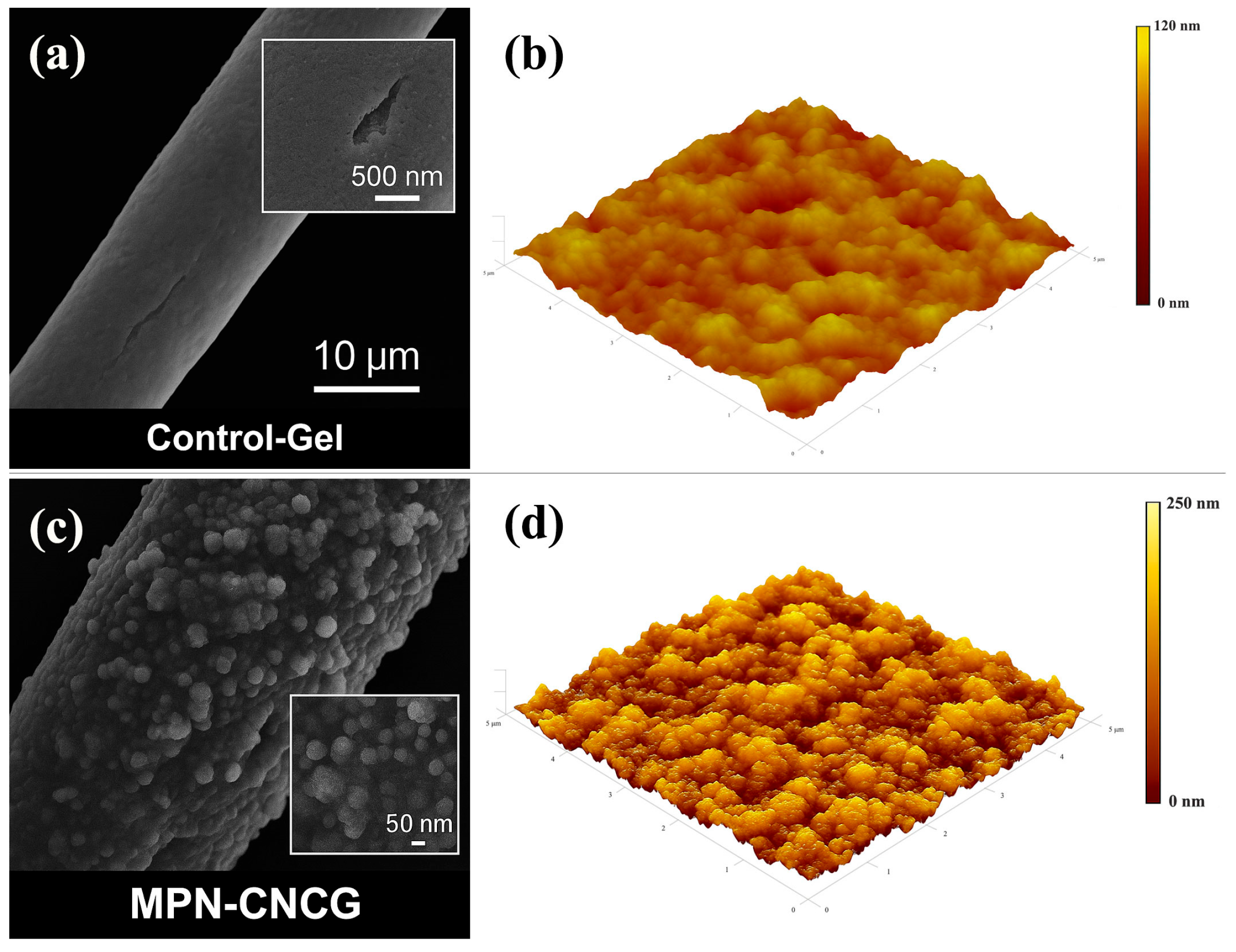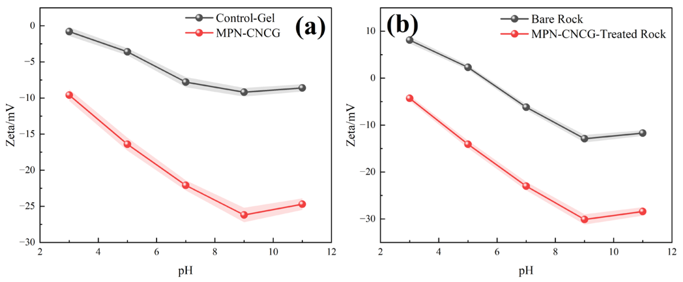 Zeta potentials of both gel dispersions and rock surface systems were measured using a Zetasizer Nano ZS zeta potential analyzer (Malvern Panalytical Instruments Co., Ltd., Shanghai, China) as a function of pH. For gel dispersions, Control-Gel and MPN-CNCG were prepared at 0.05 wt% in 1 mmol∙L−1 NaCl as the background electrolyte to control ionic strength. The pH was adjusted to 3, 5, 7, 9, and 11 using HCl or NaOH, and measurements were performed after equilibration at room temperature. For the rock surface system, rock powders with particle sizes < 45 μm were used to prepare suspensions. For the treated group, the rock powders were first contacted with MPN-CNCG solutions under shaking for 12 h, followed by centrifugation, washing, and redispersion in the background electrolyte solution. Zeta potentials were determined by electrophoretic light scattering. Each pH condition was measured independently three times, and the results are reported as mean ± standard deviation (SD).