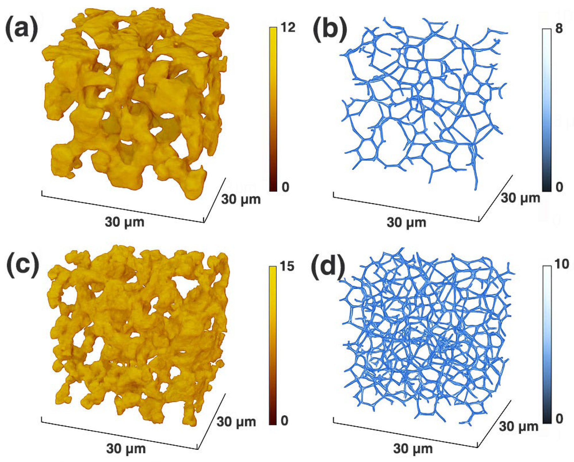 Pore structures were segmented using grayscale thresholding after noise reduction and beam-hardening correction. The segmented volumes were further processed by skeletonization to extract pore–throat network centerlines. Structural parameters—including average pore volume, pore volume fraction, pore–throat size distribution, node density, average connectivity path length, and connectivity ratio—were statistically derived from the reconstructed volumes using dedicated image analysis software.
