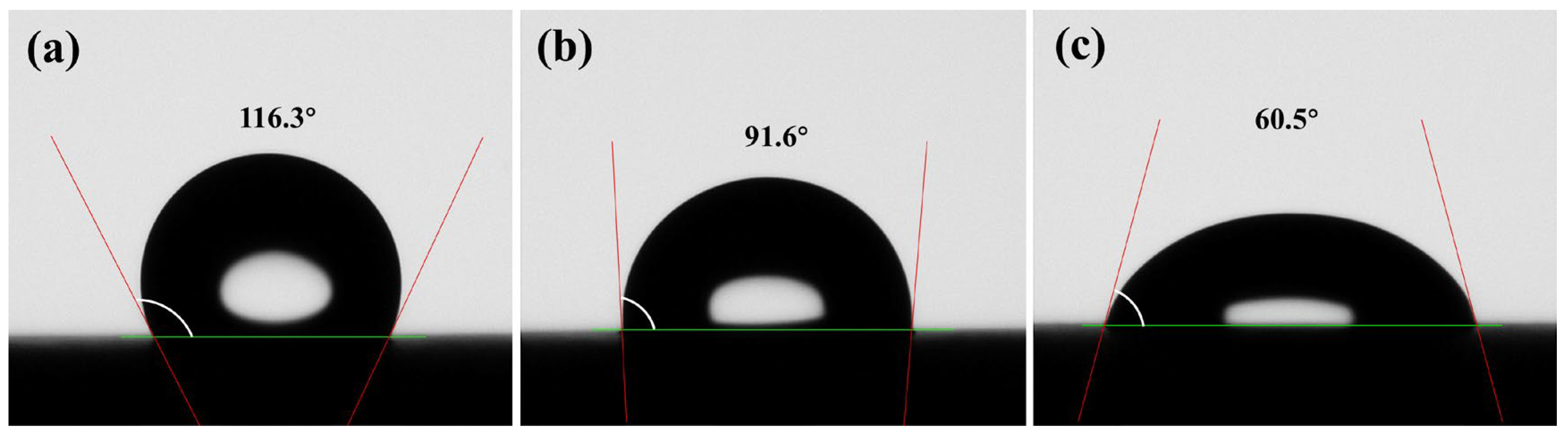 Reservoir rock samples were cut into substrates of 10 mm × 10 mm × 3 mm and dried at 60 °C for 12 h. The substrates were treated as bare rock, Control-Gel-treated rock, and MPN-CNCG-treated rock. For treatment, the rock samples were immersed in 0.10 wt% solutions for 2 h, rinsed with deionized water, and dried. Static contact angles were measured at 25 °C using a JC2000D contact-angle goniometer (Shanghai Zhongchen Digital Technology Equipment Co., Ltd., Shanghai, China) by depositing 3 μL water droplets and fitting the profiles using the Young–Laplace method. Each sample was measured five times, and the average value was reported.