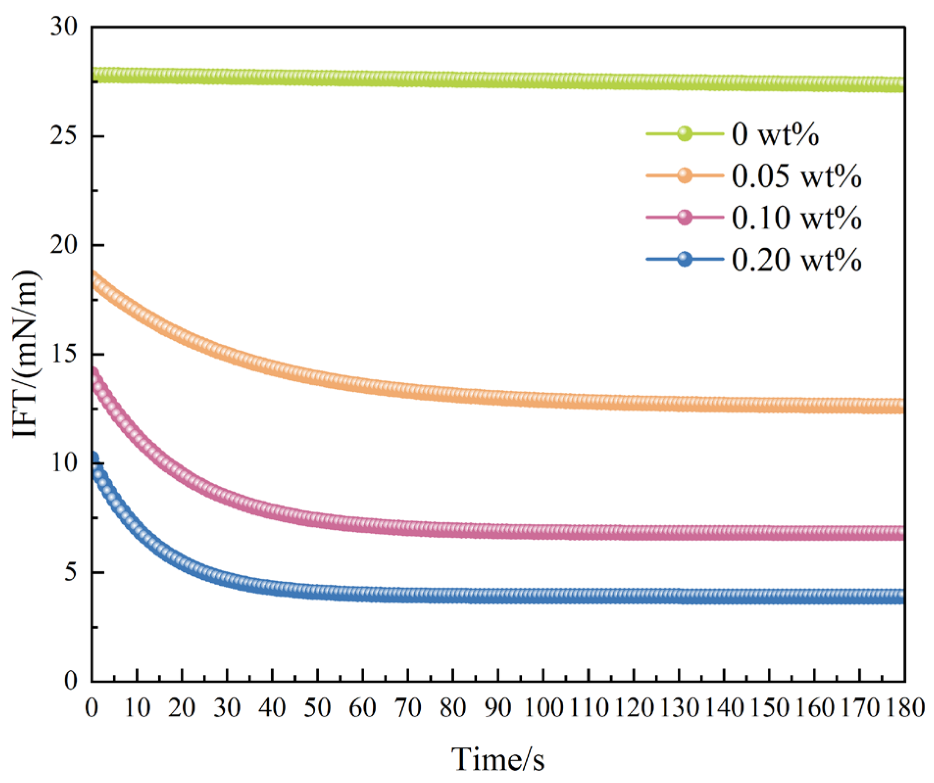 Oil–simulated formation water interfacial tension (IFT) was measured using a TX500C spinning-drop interfacial tensiometer (Beijing Haiyida Technology Co., Ltd., Beijing, China) at different MPN-CNCG concentrations (0, 0.05, 0.10, and 0.20 wt%). The experiments were conducted at 25 °C with a rotational speed of 4000 rpm. IFT–time curves were continuously recorded over 0–180 s, and equilibrium IFT values were obtained. Each condition was tested in triplicate, and the average value was used.