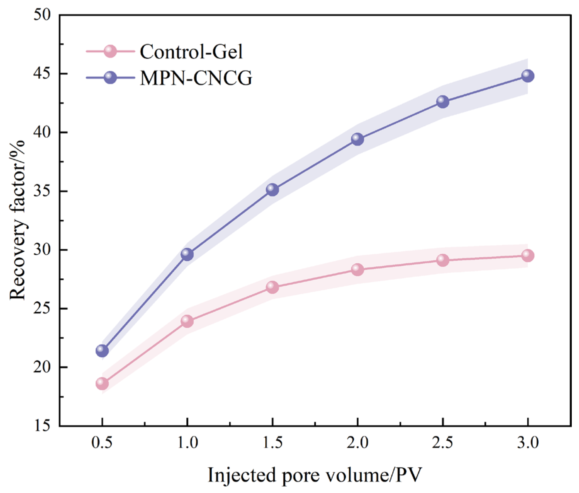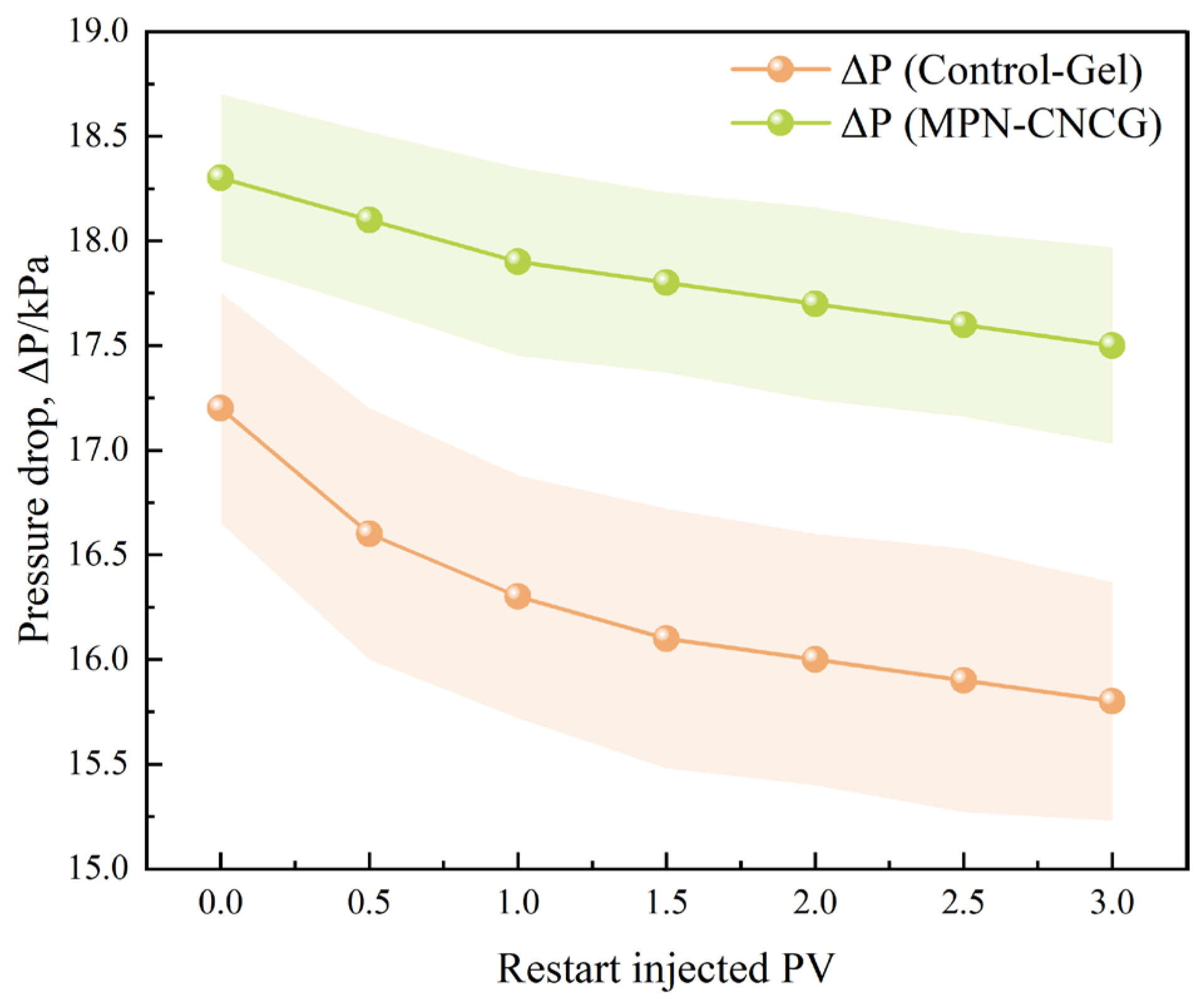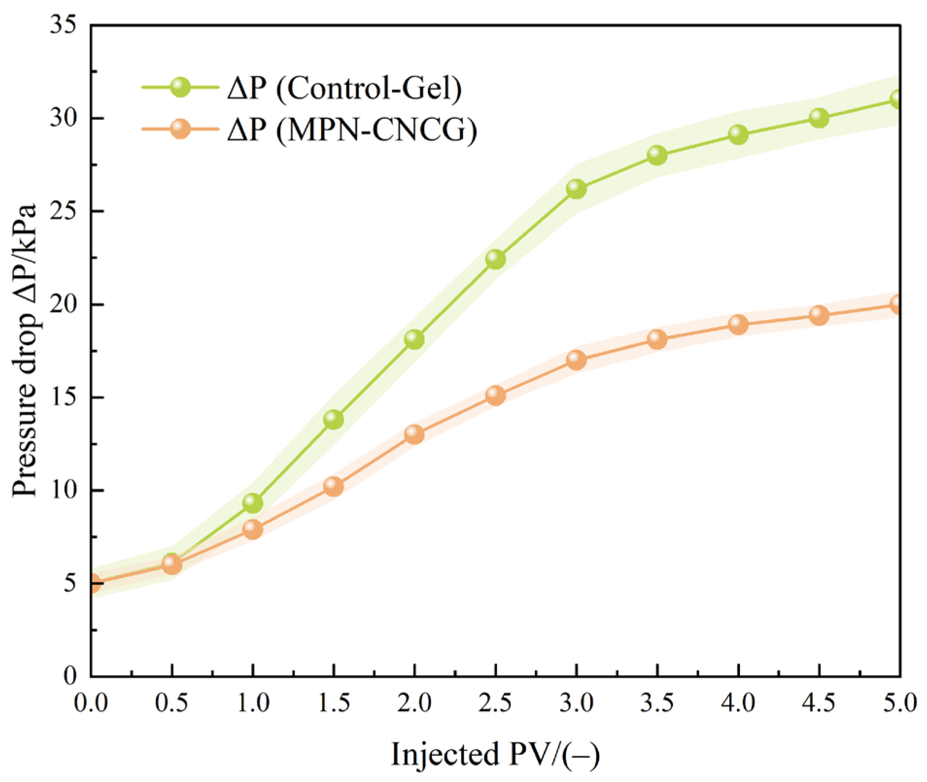 System injection: Control-Gel or MPN-CNCG was injected at the same flow rate, and the ΔP–PV response was continuously monitored to evaluate resistance buildup and spatial distribution behavior.