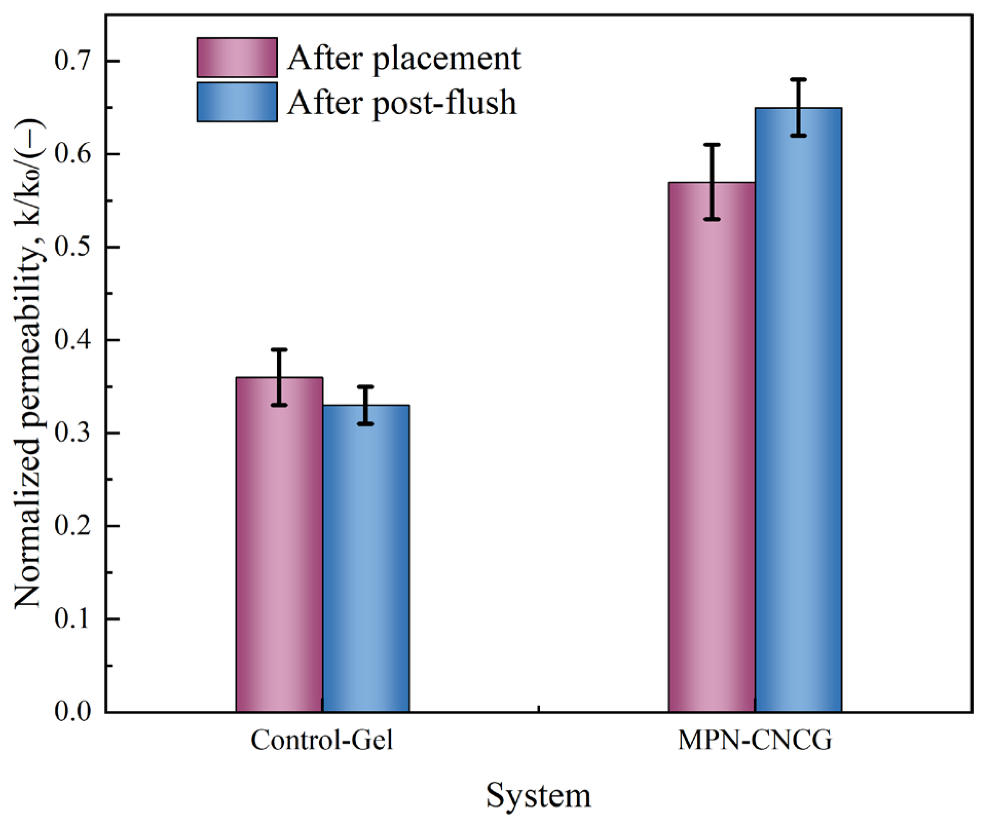 During baseline water flooding, the initial steady-state permeability k0 was calculated once ΔP stabilized. After system injection and subsequent post-flushing, permeability values (k) were recalculated under identical flow conditions.