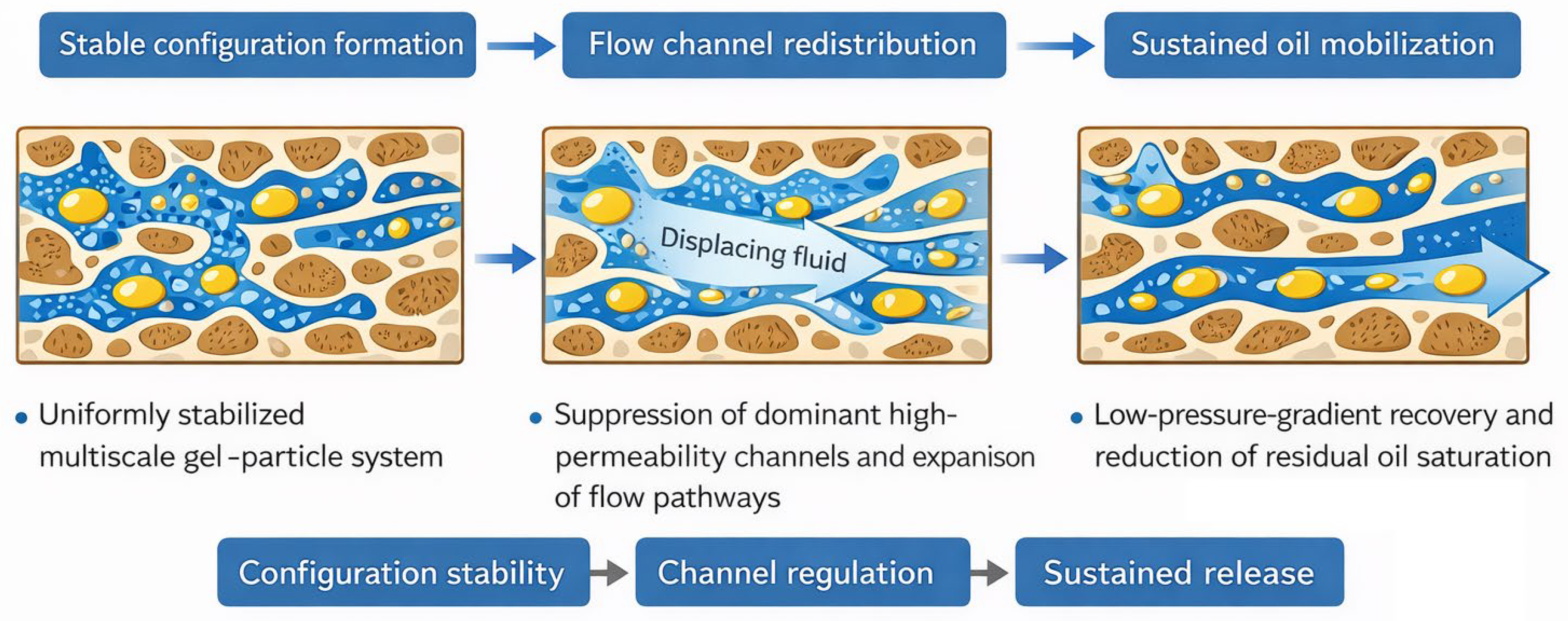 After gelation, the pH of the system was adjusted to 7.2–7.5, followed by aging at room temperature for 12 h to complete network rearrangement and structural stabilization. The obtained gel was then gently extruded through a 200-mesh nylon sieve to remove free water and stored in sealed containers for subsequent use. The final product was a multiscale gel–particle cooperative nested material (MPN-CNCG), consisting of a chemically crosslinked gel network as the continuous phase with synergistically embedded cellulose nanocrystals and polymer microspheres.