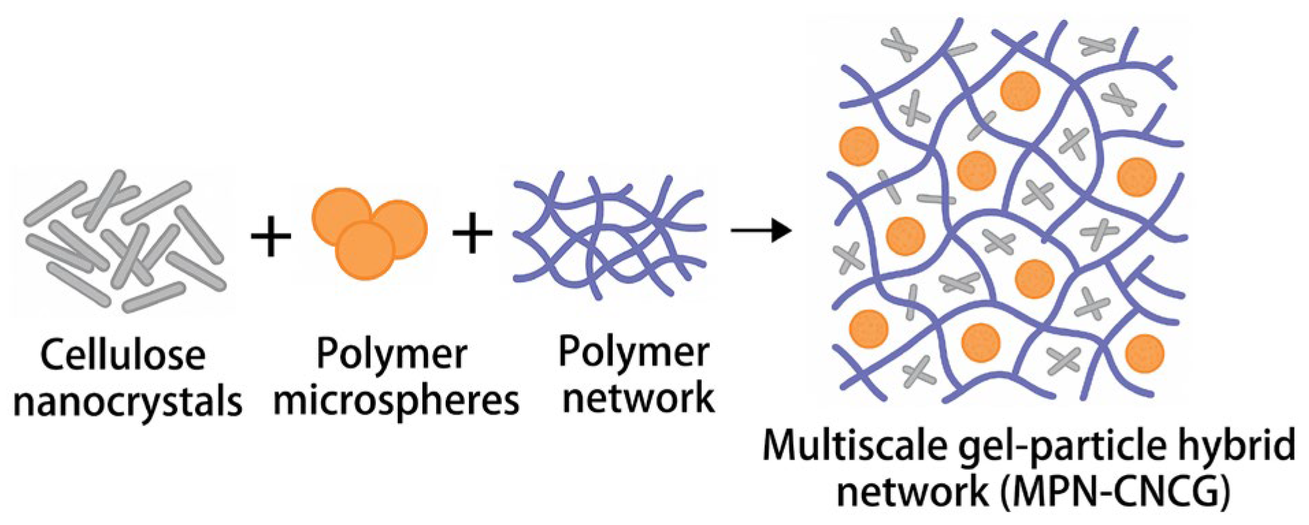 To construct the multiscale gel–particle cooperative nested system, an in situ free-radical crosslinking strategy was adopted, in which nanoscale reinforcing units and microscale nested particles were synchronously incorporated during gel network formation to achieve cooperative multiscale structuring. A schematic illustration of the synthesis procedure is shown in
