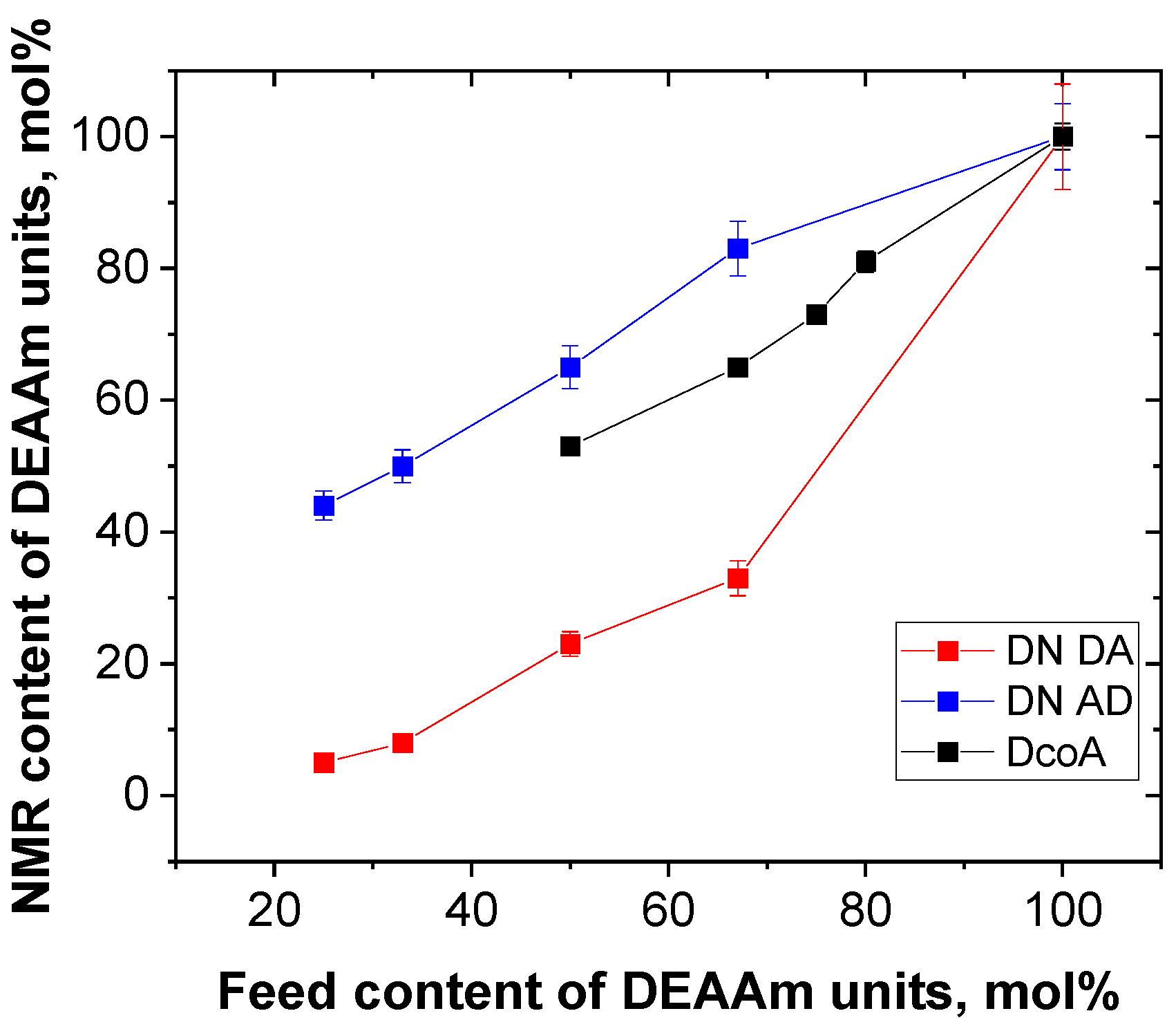 | Sample | Feed Molar Ratio (NDEAAm/NAAm)feed | NMR Molar Ratio (NDEAAm/NAAm)NMR | |