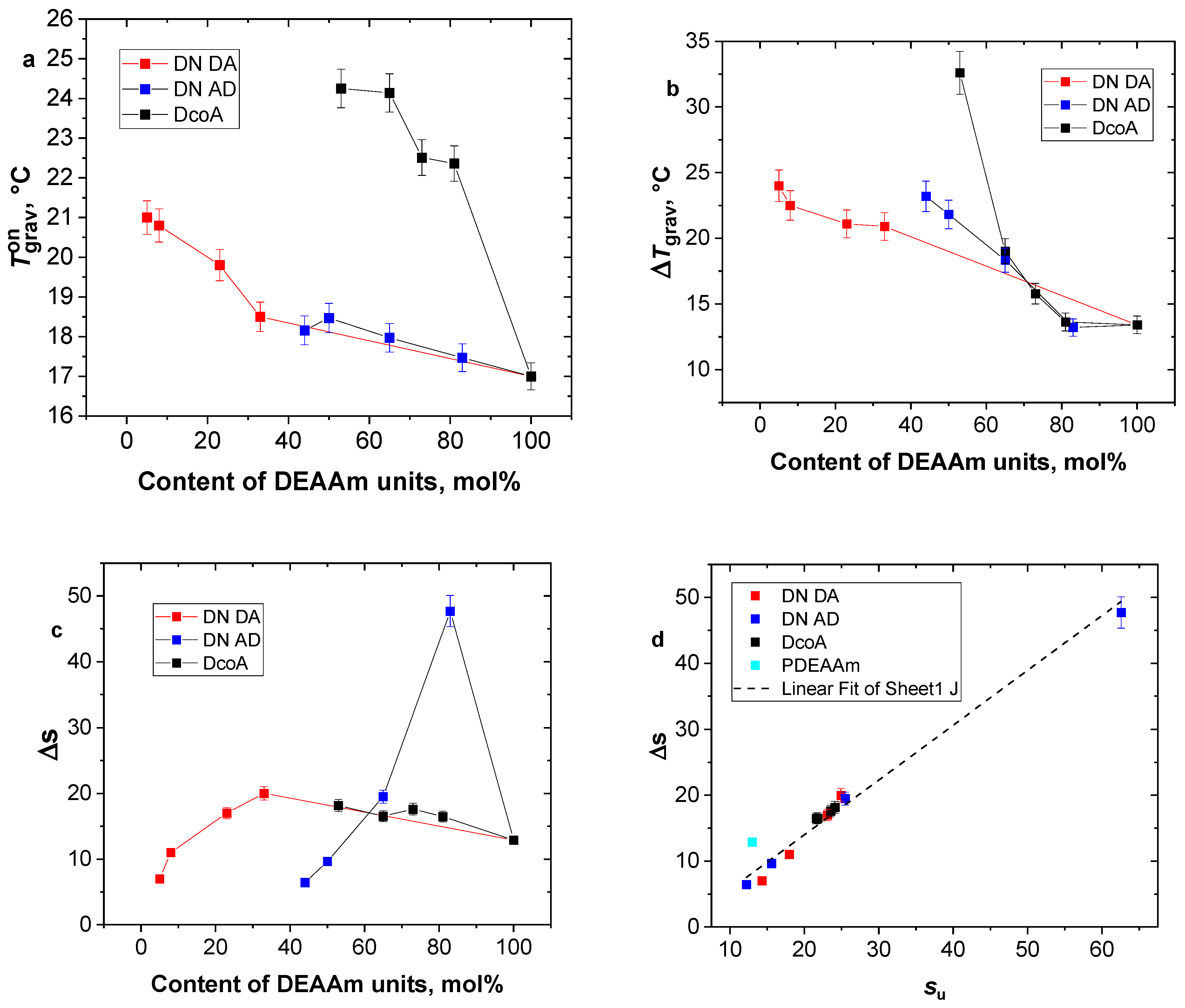 4.2.3. SN Copolymer Hydrogels P(DEAAm-co-AAm) with Various DEAAm/AAm Molar Ratios