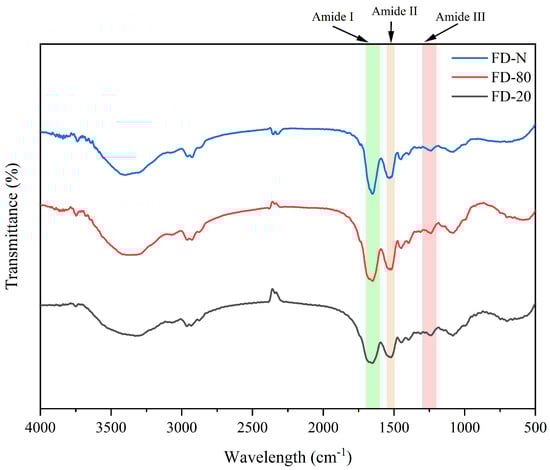 Effect of pre-freezing temperature on the FTIR spectra of MC powder. Among them, FTIR stands for Fourier-transform infrared spectroscopy, MC refers to micellar casein concentrate, while FD-20, FD-80, and FD-N are samples freeze-dried after pre-freezing at −20 °C, freezing at −80 °C, and liquid nitrogen treatment, respectively.