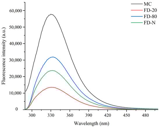 The maximum fluorescence spectrum of tryptophan can indicate the relative position of tryptophan residues within a protein and is used as an indicator of changes in the higher-order structure of proteins. Therefore, fluorescence spectroscopy is an effective technique for assessing the unfolding extent of a protein’s tertiary structure [2,23]. As shown in Figure 2, among all the tested samples, the original MC sample without drying exhibited the highest fluorescence intensity, indicating that the tertiary structure of its casein micelles was the most intact, with tryptophan residues mainly residing in a relatively hydrophobic environment. In contrast, all freeze-dried MC powder samples showed varying degrees of reduction in fluorescence intensity, suggesting that the drying process had a significant impact on the tertiary structure of the protein. Upon further observation of samples subjected to different pre-freezing treatments, it was found that the FD-80 sample maintained a relatively high fluorescence intensity after drying, which was significantly higher than that of FD-20 and FD-N. The results indicate that rapid freezing to −80 °C better preserves the natural conformation of casein, effectively protecting the internal tryptophan residues during the drying process and resulting in less structural damage. This is possibly due to the formation of fine and uniform ice crystals during rapid freezing, which reduces the mechanical stress-induced disruption to the spatial structure of the protein. In contrast, the FD-20 experienced slow freezing that promoted the formation of large ice crystals. The resulting mechanical stress likely disrupted the protein tertiary structure, leading to reduced fluorescence intensity. These results indicated that both pre-freezing treatment and dry-freezing significantly affected the structure of MC powder.
