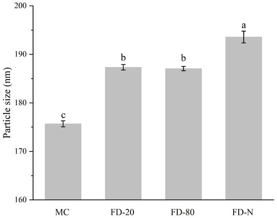 Effect of pre-freezing temperature on particle size of MC powder. Among them, MC refers to micellar casein concentrate, while FD-20, FD-80, and FD-N are samples freeze-dried after pre-freezing at −20 °C, freezing at −80 °C, and liquid nitrogen treatment, respectively. Different lowercase letters indicate significant differences.