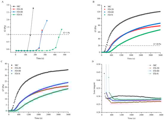 The influence of different pre-freezing temperatures on the rennet-induced gelation properties of MC powder was investigated using rheology. Figure 4 presents the time-sweep curves of rennet-induced gels for different MC powders. The rennet coagulation time (RCT), defined as the time when the storage modulus (G′) exceeds 1 Pa, is a key parameter for evaluating the gelation characteristics of casein micelles [19,26]. As shown in Figure 4A, all MC powders showed prolonged RCT compared to the original MC. No significant difference (p > 0.05) was observed between the RCT of FD-20 and FD-80, while the FD-N displayed the longest RCT. The cutting time is another critical parameter that influences final cheese quality, which is defined as the time when G′ reaches 20 Pa [27]. As shown in Figure 4B, the trend in cutting time aligns with that of RCT. These results suggested that pre-freezing temperature significantly affected the rennet-induced gelation properties of MC powder. The prolongation of RCT in all dried samples may be due to the masking of the cleavage site of κ-CN during the drying process, thereby reducing the enzymatic cleavage efficiency and resulting in an increase in RCT. Among them, the freezing rates of FD-20 and FD-80 were lower than that of FD-N. As a result, FD-N retained more κ-CN on the micelle surface, requiring a longer reaction time for enzymatic cleavage, which further extended its RCT.