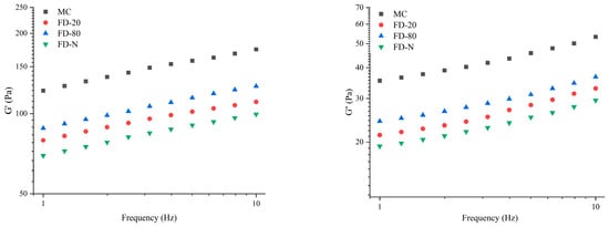 As shown in Figure 5, a frequency sweep was performed immediately after the time sweep test. As the frequency increased, both G′ and G″ of all samples gradually rose. Among all samples, MC displayed the highest G′ and G″ values. After drying, the G′ and G″ of all samples exhibited varying degrees of reduction, following the order of FD-80, FD-20, and FD-N, indicating that the drying process disrupted the gel properties of the samples. Furthermore, the rennet-induced gels of all samples exhibited consistent trends in G′ and G″ changes, with G′ consistently higher than G″, indicating that elastic behavior dominated in the gels. By fitting the linear relationship between G′ and frequency on a logarithmic scale, the results showed that the slopes of the four samples ranged from 0.14 to 0.16 (R2 = 0.99). This indicates that the gels have weak frequency dependence, which may be related to bond rupture and reformation as well as intermolecular interactions within the protein gels [33].