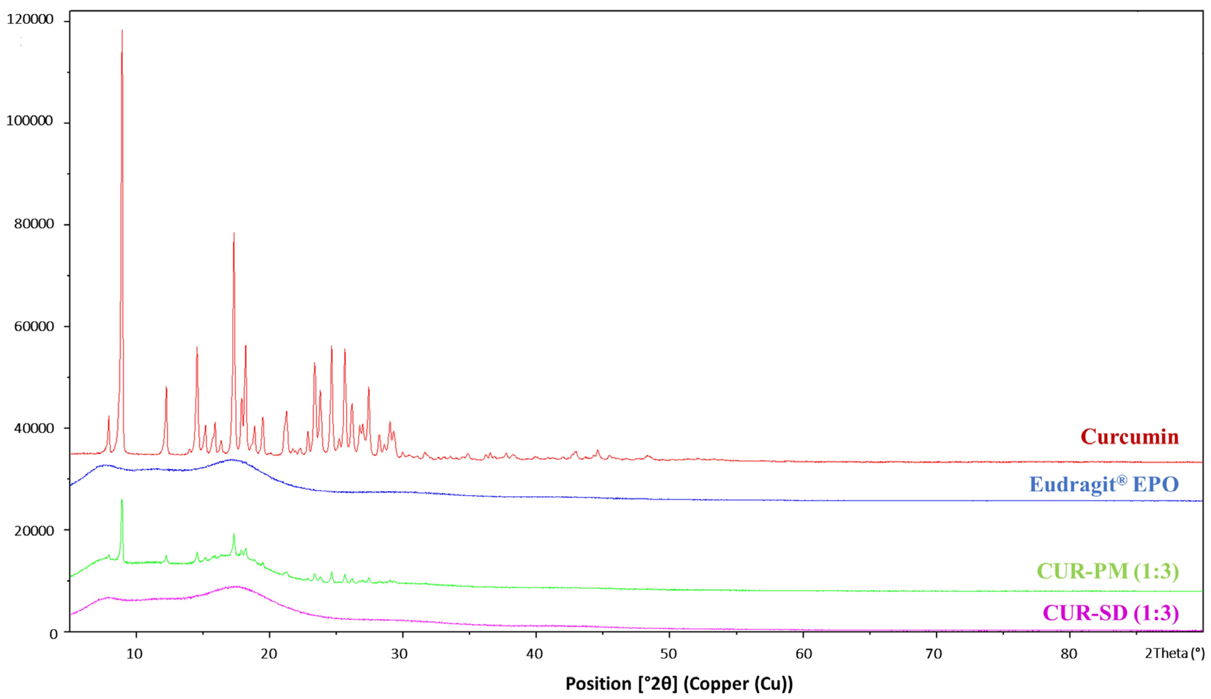 2.1. Physicochemical Characterization of Curcumin Solid Dispersions
