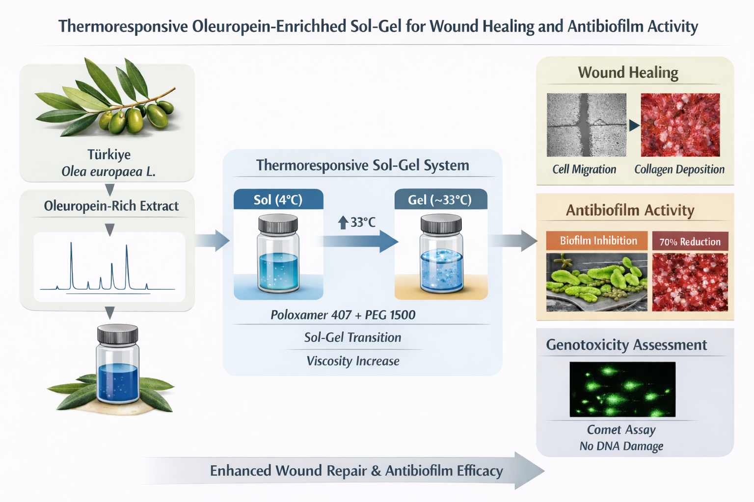 Based on these considerations, the present study aims to develop a thermoresponsive sol–gel formulation incorporating an oleuropein-rich aqueous olive leaf extract obtained from the Gömeç region and to evaluate its pharmaceutical and biological performance. The study integrates HPLC-based oleuropein characterization, physicochemical and thermoresponsive analysis, mechanical evaluation, and in vitro biological assessment, including cytocompatibility, wound-healing-associated responses, and antibiofilm activity. This approach provides a comprehensive framework for exploring olive leaf-derived oleuropein as a multifunctional natural raw material for localized therapeutic applications.