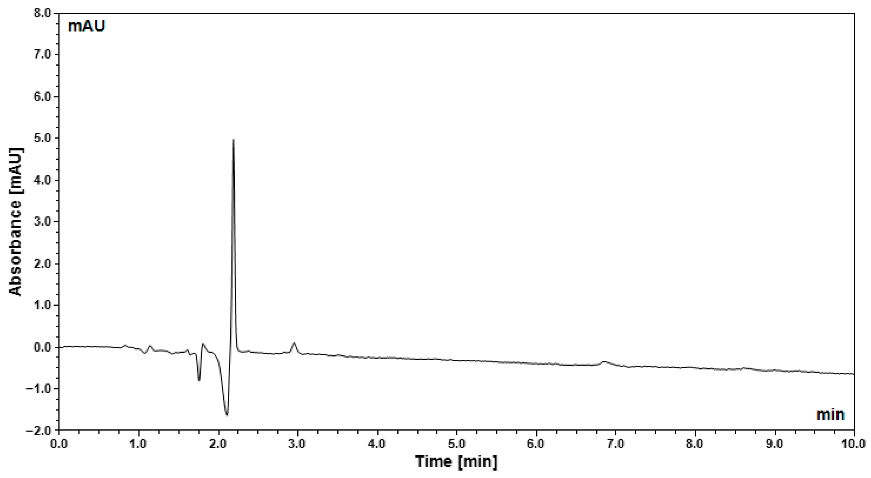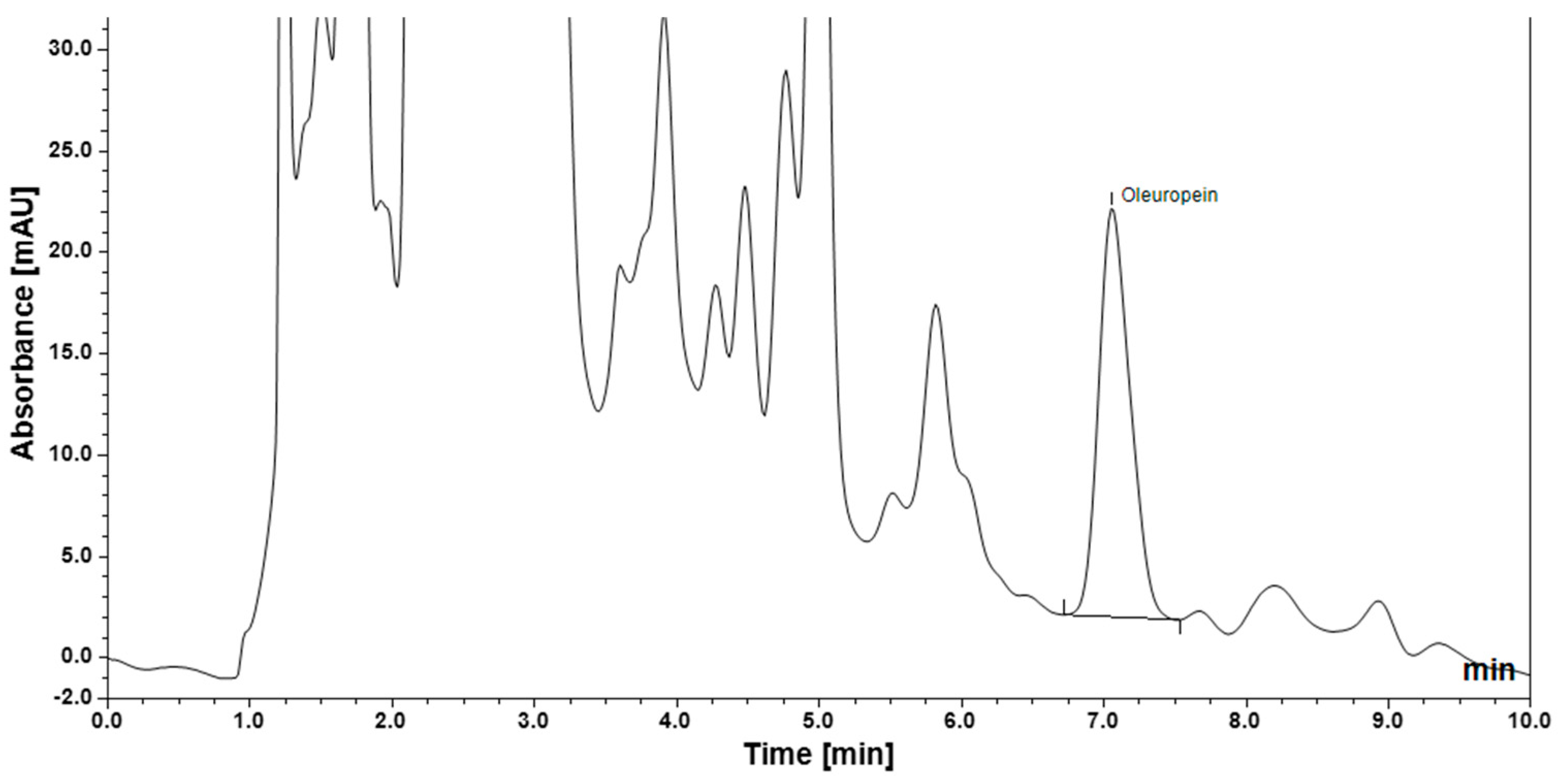 The specificity of the method was evaluated by analyzing a blank solution under the same chromatographic conditions. The blank chromatogram revealed no detectable peaks at the retention time corresponding to oleuropein (RT = 7.23 min), indicating the absence of interference from solvents, reagents, or system-related contaminants (