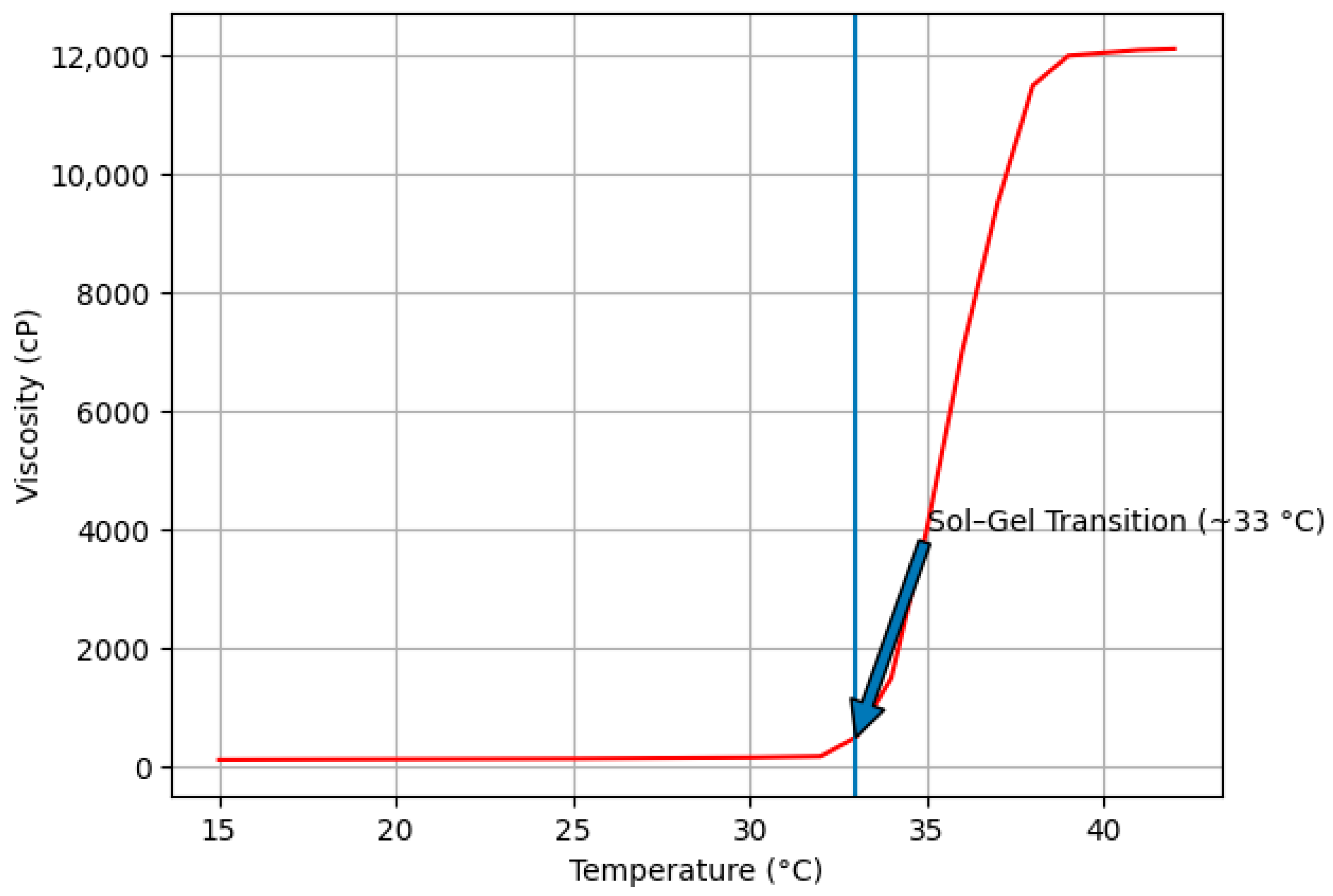 Upon gradual heating from room temperature to 42 °C, the formulation exhibited a characteristic thermally induced phase transition. A pronounced and rapid increase in viscosity was observed at approximately 33 °C, corresponding to the sol–gel transition temperature. This sharp viscosity elevation indicates the formation of a structured gel network associated with temperature-triggered micellar packing of Poloxamer 407.