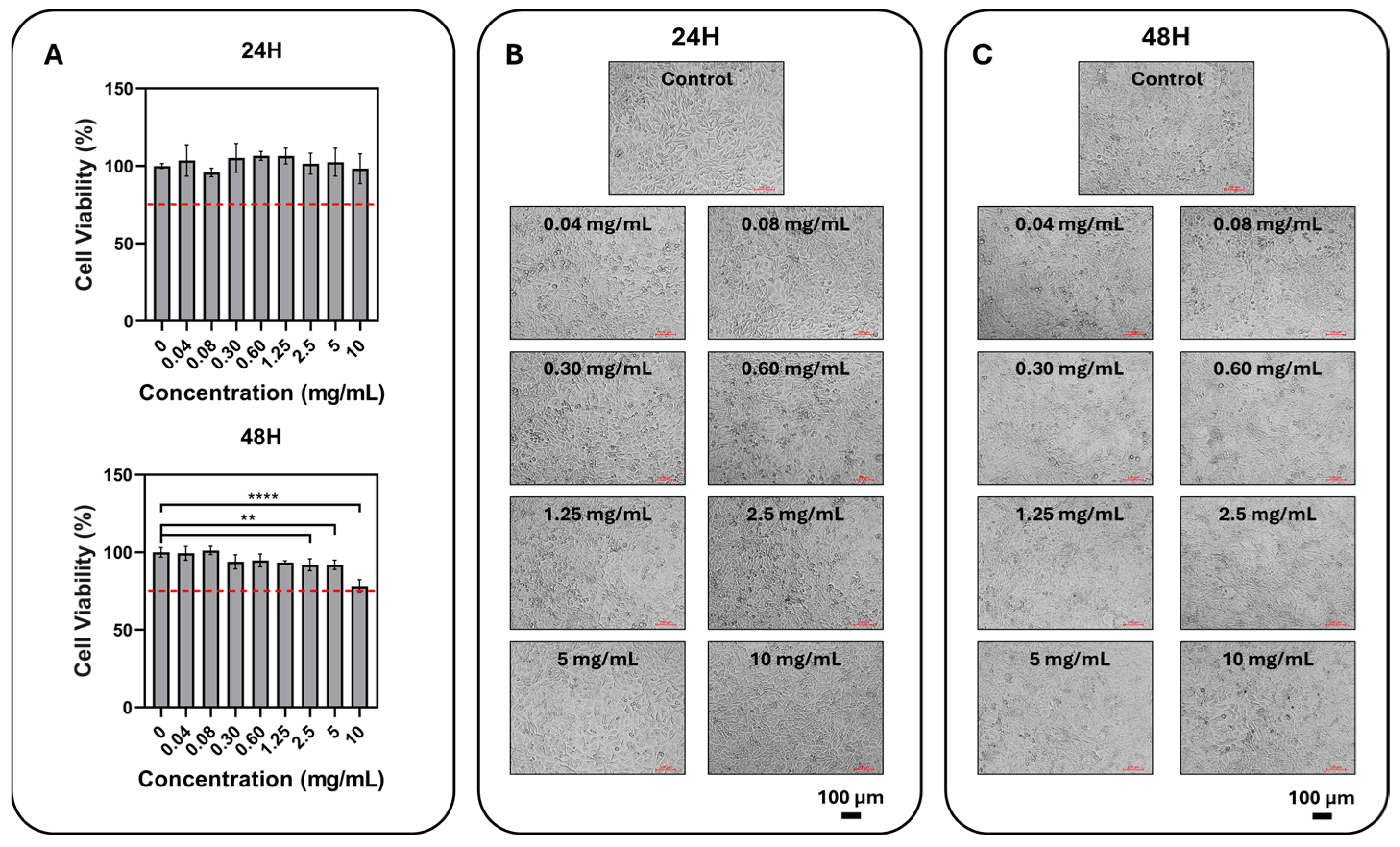 Figure 5) obtained with the lyophilized total formulation (0.04–10 mg/mL, expressed as mg dry formulation/mL medium) showed that cell viability remained close to the control across most tested concentrations. At 24 h, viability ranged from 95.80 ± 2.74% to 106.53 ± 2.80%, with the lowest value observed at 0.08 mg/mL and the highest at 0.60 mg/mL. At 48 h, viability ranged from 78.17 ± 4.11% to 101.24 ± 2.68%, with the lowest value observed in the 10 mg/mL group and the highest at 0.08 mg/mL. These findings indicate that the formulation was well tolerated over a broad concentration range, while prolonged exposure to the highest concentration resulted in a moderate reduction in metabolic activity. The similarity of cell morphologies to the control group suggests that this decrease in metabolic activity may be related to a mild stress response developing at high doses or a slowing of the proliferation/metabolism rate, rather than widespread/acute toxicity. In this respect, the decrease observed only at the highest dose and with longer exposure supports the idea that the formulation has a generally biocompatible safety window but that a threshold mechanism that may disrupt cell homeostasis at high doses is possible.