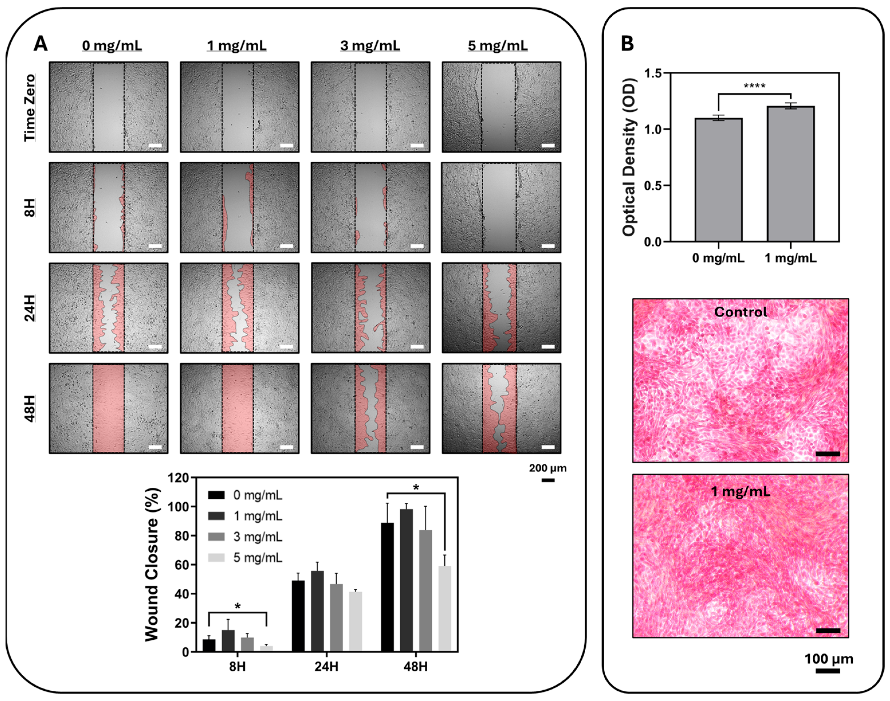 Figure 6A). At 8 h, wound closure was 8.62 ± 2.49%, 15.02 ± 7.37%, 9.86 ± 2.79%, and 4.01 ± 1.22% for the 0, 1, 3, and 5 mg/mL groups, respectively, with the 5 mg/mL group showing significantly lower closure than the control (