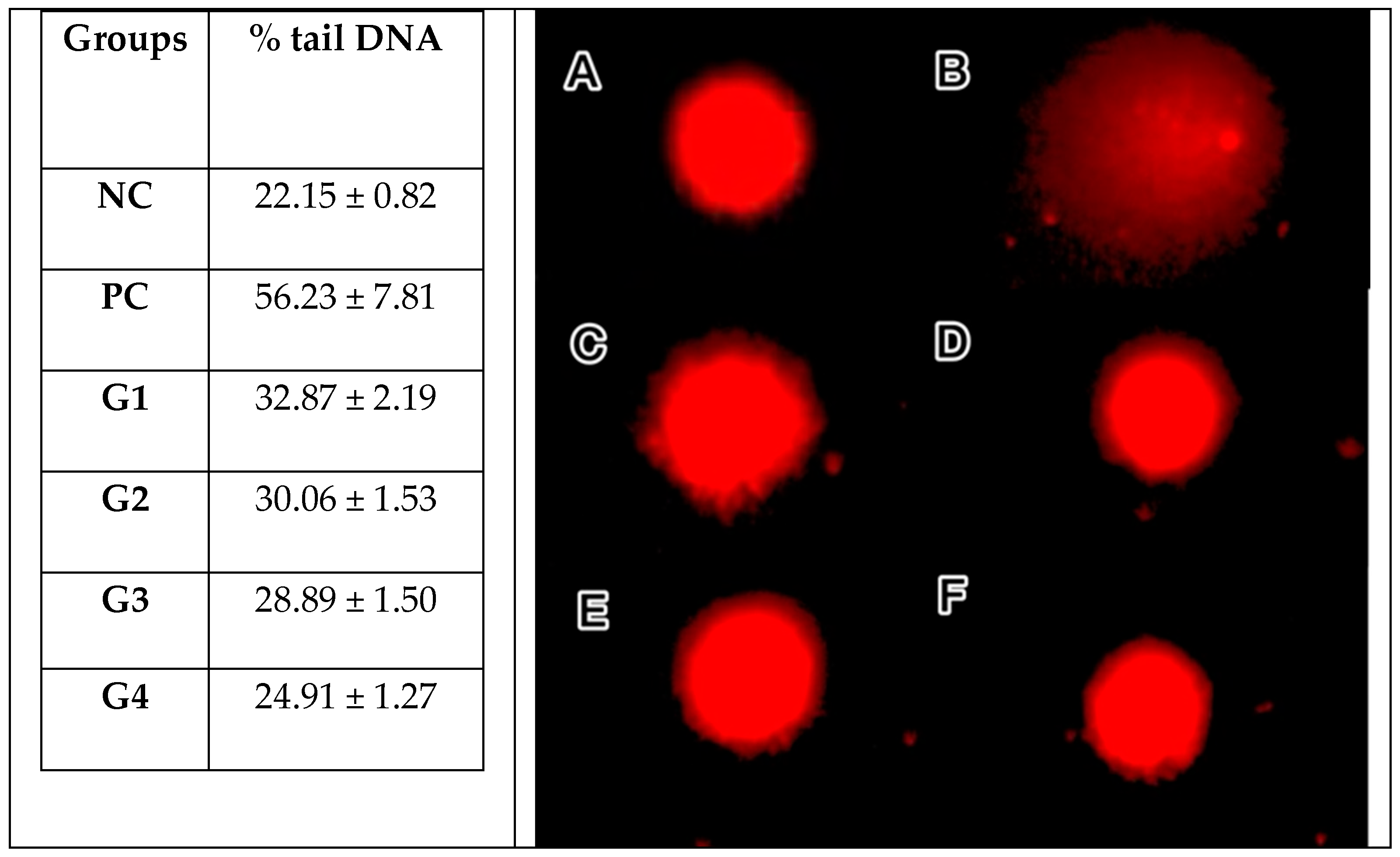 Ethidium bromide (EtBr, 20 μL/mL) was used for each slide for image analysis at ×40 magnification under a fluorescent microscope (BAB, Ankara, Türkiye) equipped with a 546 nm excitation filter and 590 nm barrier filter. One hundred cells were counted and scored by BAB Fluorescent Microscope with the BAB Bs200ProP/BsComet DNA Comet Assay Image Analyzer program for each study group. Welch’s ANOVA was used to analyze group differences due to heterogeneity of variances, and Tamhane’s T2 post hoc test was applied for pairwise comparisons between groups. A p-value of ≤0.05 was considered statistically significant. The statistical software SPSS (ver. 23.0) was used to analyze the data.