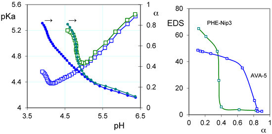 (Left) Relationships between the acidity constants (pKa, open squares), degree of protonation (α, filled circles) and pH of the hydrogels PHE-Nip3 (green line) and AVA-5 (blue line); (Right) The equilibrium degree of swelling (EDS) in relation to α for the hydrogel PHE-Nip3 (green line) and AVA-5 (blue line) (all data are referred to 25 °C and 0.15 M NaCl).