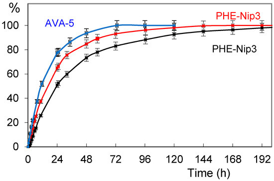 A closer behavior of the two drugs was observed for the release profiles from AVA-5 hydrogel. In this case the macromolecular structure displays a greater amount of ionized carboxyl groups, along with a corresponding number of hydrophobic isopropyl groups present in the l-valine moiety. In addition, the hydrogel contains a greater degree of cross-linking (5 mol %) with EBA units making it less swellable. The greater number of carboxyl groups makes it available to a greater loading amount of drugs. In fact, a loading of 53.6 wt % and 44.2 wt % was obtained for paroxetine and duloxetine, respectively. The release of duloxetine and paroxetine from the hydrogel AVA-5 is always greater than that shown by the PHE-Nip3 hydrogel, despite the higher degree of crosslinking. It is to be expected that the increased crosslinking of the polymer ensures a slower release of the drugs. This is in line with the hydrogel AVA-5, which released over time the two drugs. As previously reported, the analogous hydrogel AVA-2 (crosslinked with 2 mol % of EBA), containing uploaded citalopram and trazodone [26], released the drugs in much less time (within 24 h), despite the lower degree of crosslinking and comparable pKa values [7]. This means that, by considering the same drug, the electrostatic interaction between the drug and the hydrogel is weaker for AVA-5, and then the drug is released more rapidly in aqueous saline solution. The greater degree of crosslinking exerts the further role of slowing down the diffusion of the drug through the denser network. In all cases, however, the release of the drug with secondary amino nitrogen is ensured for long periods of time.