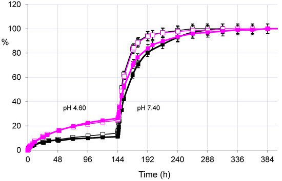 Releasing profiles (% in relation to time) of paroxetine (dark lines) and duloxetine (pink lines) from the hydrogel PHE-Nip3 with (empty squares) and without (filled squares) application of the alternating magnetic field (20 kHz/50 W). The release was performed at 25 °C in acetate (pH 4.60) and in PBS (pH 7.40) buffer solutions.