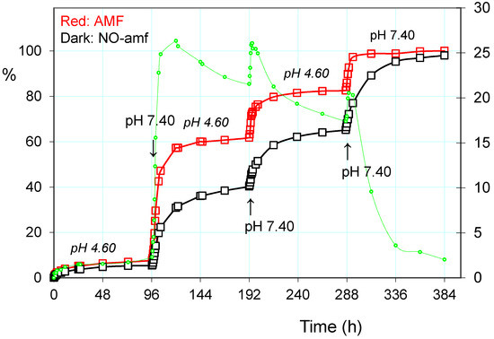 Paroxetine release (%) from the hydrogel PHE-Nip3 on pulsed variation of buffer solutions (PBS, pH 7.40; acetate, pH 4.60) with (red line) and without (dark line) AMF application (20 kHz/50 W). The green dashed line represents the difference (%) between the release values with and without the application of AMF.