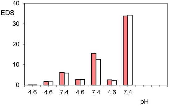 The addition of a further trigger based on the alternating magnetic field greatly increases the release of paroxetine, especially when the pH pulses are implemented [37]. In the same Figure 4 are reported the three steps of pulses with PBS solution at pH 7.40, superimposed on the normal release at pH 4.60. As is noted at the end of the first pulse stage, there is a net gain of about 20% of drug release; the application of the AMF trigger improves the leakage of the drug. The cumulative drug release becomes less and less pronounced after each pulse of pH, as the remaining amount of loaded drug becomes increasingly lower and this decreases the concentration gradient for the release of the drug itself. It is evident that the unloading of the drug consequently permits hydration of the hydrogel, especially at a pH greater than its pKa. This was measured in terms of EDS that actually reveals a gradual increase in EDS with the repeated pulsation cycles at pH 7.40 (Figure 5). The observed gradualness seems to be not dependent on the effect of AMF, also because the latter produces effects of collapse of the hydrogel due to the developed hyperthermia.