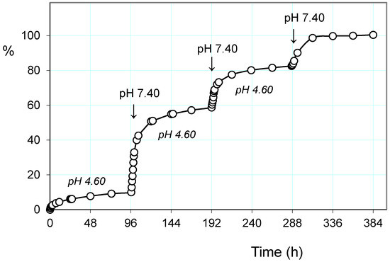 Based on the above observations, and mainly of the fast response to stimulation of pH and the alternating magnetic field, the cumulative release of paroxetine from the drug-loaded PHE-Nip3 hydrogel was evaluated at lower pH, under applied pulses at pH 7.40. In particular, a slow and gradual release at pH 4.60 was carried out for a long period of time in which only about 20% of the drug was released (Figure 4). After four days, the outside PBS saline solution at pH 7.40 was maintained only for two hours. In this short period, the greater pH triggered the release that quickly increased to reach values of about four times higher than the previous one. The restoration of pH 4.60 solution did not block the release immediately, but the drug continued to flow in the external solution for a further three hours and then settle the release at low constant values. A second change in the external solution to pH 7.40 showed a further increase of the release rate in the two-hour experience. The subsequent restoration of pH 4.60 solution reported a flat release for a long time of four days. The third and final change in the external PBS solution was constantly maintained throughout the final period of time and up to the completeness of the release of paroxetine. The comparison of the three trigger steps shows lower release of the drug in the second stage than in the first one; its cumulative release goes through about 40% in the first to about 65% in the second stage. The third stage instead recovers most amount of drug as the external solution remains at higher pH 7.40 for all the settled time of four days.