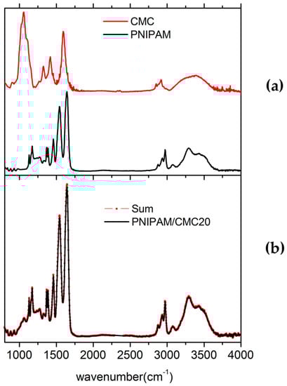(a) Attenuated total reflectance–Fourier transform infrared spectroscopy (ATR-FTIR) spectra of carboxymethylcellulose (CMC) sodium salt and poly(N-isopropylacrylamide) (PNIPAM) hydrogel. The spectra were measured under the same instrumental conditions. (b) Fitting of the spectrum of the PNIPAM/CMC20 sample as a sum of the spectra of CMC and PNIPAM hydrogels weighted by optimized scaling factors. The spectra were measured for the lyophilized hydrogels.