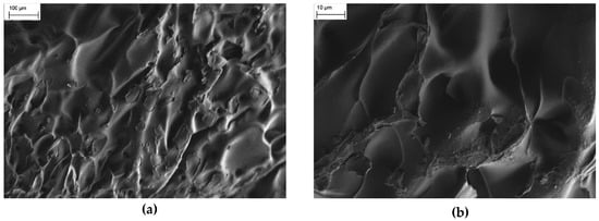 FESEM images show that the microstructures of pure PNIPAM and PNIPAM/CMC lyophilized hydrogels are significantly different. Pure PNIPAM hydrogels have a morphology consisting of relatively flat foils over which large craters (size around 100 nm) are visible (Figure 2a). Even at higher magnifications, PNIPAM hydrogels exhibit a non-porous structure (Figure 2b). The images shown here are representative of the morphology of the whole samples.