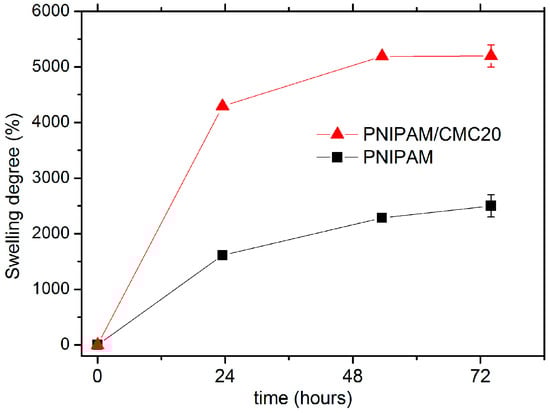 The attainment of the equilibrium swelling degree (SDeq) was checked by measuring swelling kinetics starting from lyophilized samples of the hydrogels (Figure 5). These data indicate that the swelling process is slightly faster for the PNIPAM/CMC20 hydrogel than for the pure PNIPAM hydrogel. The SDeq measured at 295 K of the PNIPAM/CMC20 sample (5200% ± 200%) is much larger than that of the PNIPAM hydrogel (2500% ± 200%). On the contrary, the addition of 5 wt % of CMC to the PNIPAM hydrogels slightly reduces its SDeq (1900% ± 100%). Similar SDeq values (ca. 2000%) were measured for the PNIPAM/CMC5/Fe3O4 hydrogel. These results can be explained considering that the interactions of the hydrophilic groups of PNIPAM with those of CMC are more favorable than with water at low CMC concentration; thus, a decrease of the swelling degree is observed [15].