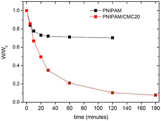 Water retention (defined as the weight W of the hydrogel divided by weight of the hydrogel swollen at 295 K W0) as a function of immersion time in water at 315 K for the pure PNIPAM and the PNIPAM/CMC20 hydrogels.