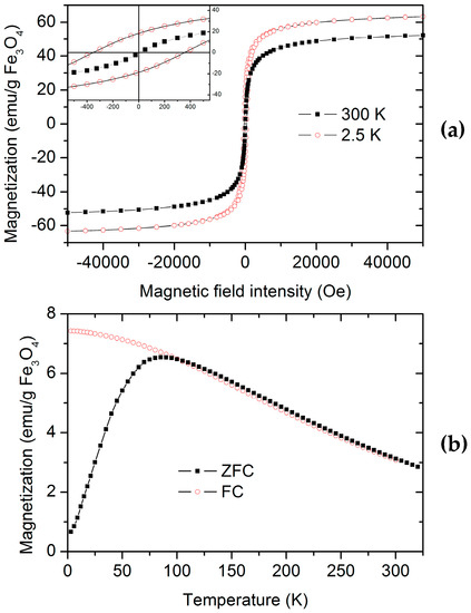 Magnetization versus field intensity and zero field cooling (ZFC) and field cooling (FC) curves were measured by means of a Superconducting Quantum Interference Device magnetometer (Quantum Design Ltd. San Diego, CA, USA).