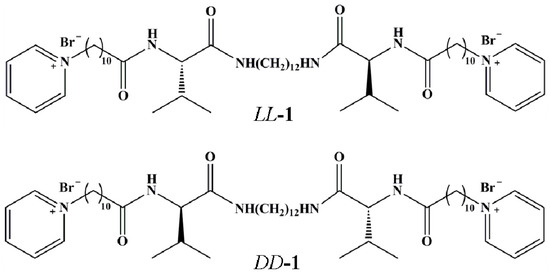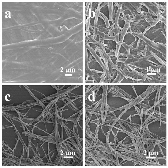 Bola-type compounds LL-1 (derived from L-valine) and DD-1 (derived from D-valine), as shown in Figure 1, can aggregate and form physical gels in deionized water at a concentration of 30 g·L−1 at 25 °C [5]. In this work, their self-assemblies are used as the templates to prepared phenolic resins. The FE-SEM and TEM images of the phenolic resin samples are shown in Figure 2. They are single-handed helical bundles comprised of many ultrafine nanofibers. Left-handed helical (Figure 2a) and right-handed helical (Figure 2b) phenolic resins, named as l-HPR and d-HPR, were prepared using LL-1 and DD-1, respectively. The diameters of the bundles range from 300 nm to 1 μm while those of the ultrafine nanofibers are uniform at about 40 nm. The lengths of nanofibers can reach tens of microns, although part nanofibers are broken due to the serious stirring. From the TEM images, it is found that the ultrafine nanofibers are helical too (Figure 2c,d). Moreover, there are no clear mesopores identified on the nanofibers. The isothermal nitrogen adsorption–desorption plots for the helical phenolic resins are shown in Figure S1. The samples show type-II isotherms with a capillary-condensation step appearing at relative pressure (P/P0) between 0.8 and 1.0, which originates from voids within and among the bundles. The Barrett–Joyner–Halenda (BJH) pore size distribution plot, determined from the desorption branch, is shown in Figure S1b. The average void width within the bundles is 21 nm. After the d-HPR sample was pyrolyzed at 600 °C for 2.0 h, carbonaceous fibers with diameter of 200–500 nm were obtained (Figure S2). However, no obvious helix could be discerned from Figure S2. It seemed that the surface of helical bundles merged together during carbonization. The possible reason was that the obtained phenolic resin was liner when using 2,4-dihydroxybenzoic acid as the precursor [17].