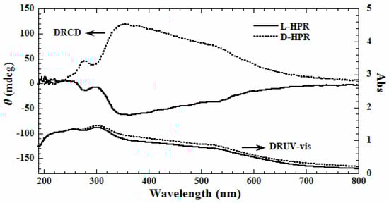 DRUV-vis and DRCD spectra of left-handed and right-handed helical phenolic resin bundles.