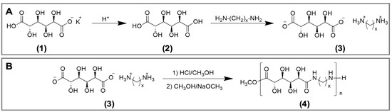 The poly(glucaramide)s were obtained as previously reported [20]. As a first step in polymers synthesis, monopotassium glucarate (1) was acidified to glucaric acid (2) then allowed to react with the desired diamine to produce a diammonium d-glucarate salt (3) (Figure 1A). This step ensures stoichiometric balance of the co-monomers. Next, the diammonium d-glucarate salt (3) was esterified in methanolic HCl and then neutralized with sodium methoxide to promote polycondensation to form single diamine poly(glucaramide)s (4) (Figure 1B). Alternatively, if two different diammonium d-glucarate salts are reacted, a mixed diamine poly(glucaramide) can be obtained. For this study, three different poly(glucaramide)s were employed. The first polymer, C4 was obtained from glucaric acid and tetramethylene diamine. The second polymer, C4C6—a mixed poly(glucaramide), was obtained from glucaric acid with tetramethylene diamine and glucaric acid with hexamethylene diamine. The third poly(glucaramide), C6 was obtained from glucaric acid and hexamethylene diamine. The structures and degrees of polymerization for the synthesized poly(glucaramide)s were confirmed by 1H-NMR (data not shown) as previously described [19].