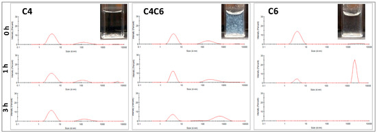 Particle analyses of the poly(glucaramide) solutions. Particle size distribution in water at 0, 1 and 3 h for the C4 (left), C4C6 (middle) and C6 (right) polymer solutions as observed by dynamic light scattering (DLS). All solutions were prepared at non-gelling concentrations (0.5% w/w) to allow the observation of the nanoparticles and their behavior in solution. Axes information: x—Intensity (%); scale: 0–30%; y—Size (d. nm); scale: 0–10,000 nm. Insets—Visual appearance of poly(glucaramide) solutions after 24 h illustrating the absence of aggegation or precipitation in C4 solutions (top left), aggregation and pre-gellation in C4C6 solutions (top middle) and precipitation in C6 solutions (top right).