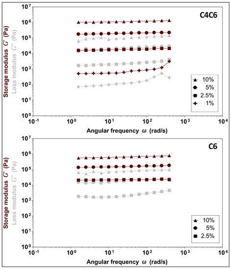 With an understanding of the hydrogel structures, the macroscopic properties of these materials were investigated rheologically. First, the viscoelastic region of these materials was examined to determine the appropriate oscillation stress for further testing (data not shown). The readings for both hydrogels (C4C6 and C6), and all tested concentrations (2.5–10% for C4C6 and 1–10% for C6), were linear in the 1–200 Pa range. Therefore, all further testing was conducted within these stress values.