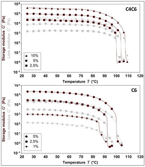 Given that the polymers are solubilized at elevated temperatures and gel upon cooling, the temperature dependent behavior of C4C6 and C6 hydrogels was investigated. The data indicates that the gel-to-liquid transition temperature (TG→L) is concentration dependent. Furthermore, our results suggest that the doubling of the polymer concentration imparts a ~3 °C increase in the TG→L for the C4C6 hydrogels, and an ~8 °C increase in the TG→L for C6, respectively (Figure 6 and Table 3).