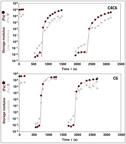 Considering the effect of the temperature on the gelation process of these hydrogels, the potential thermoreversibility of these materials was next interrogated. For this, the gels (5% w/w C4C6 and 5% w/w C6) were liquefied at TG→L + 3 °C, then rapidly cooled to 25 °C and analyzed rheologically. The data shows that both C4C6 and C6 hydrogels are capable of consistently reverting to a gel state with a G’ value identical or similar to the initial value (Figure 7).