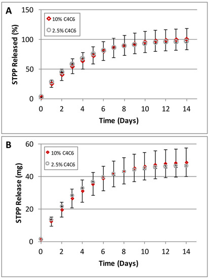 C4C6 hydrogels obtained from 2.5% and 10% polymer solutions were loaded with 30 mg STPP/g gel and monitored for release for 14 days (Figure 8). The results show that the entrapped STPP is slow-released over a period of 14 days, with a more rapid rate in the first 5 days and diminishing after day 10 (Figure 8A). No differences were observed between the STPP amounts released from the 2.5% versus the 10% hydrogels (Figure 8B).