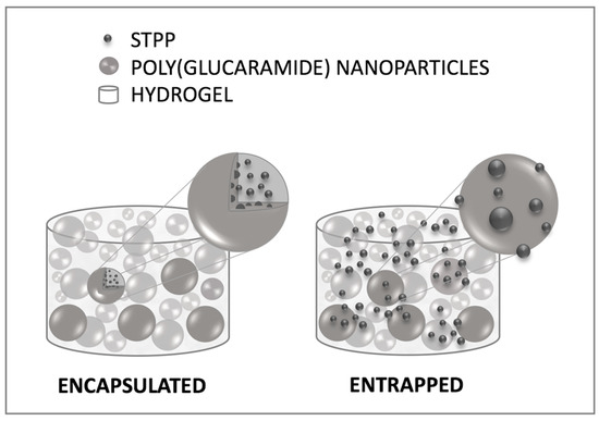 Illustration of potential STPP loading mechanisms in the poly(glucaramide) hydrogels with the small molecules either encapsulated in the nanoparticles (right) or entrapped in the hydrogel network (left).