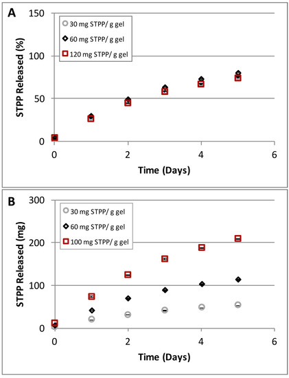 Mechanistically, two different scenarios could be envisioned for the STPP loading: 1—the phosphate is encapsulated inside the nanoparticles; 2—the phosphate is outside the nanoparticles, entrapped at the surface or between the nanoparticles (Figure 9). To investigate the loading mechanism of STPP, hydrogels (2.5%) were loaded with different concentrations of phosphate (30–120 mg STPP/g gel), in an attempt to saturate the nanoparticles (Figure 9). The highest concentration of STPP used (120 mg/g gel) was limited by the molecule’s solubility. Our hypothesis was that, in the case of the first loading scenario—encapsulation—the addition of STPP concentrations exceeding the encapsulation capacity of the nanoparticles would result in a burst-type release of the phosphate.