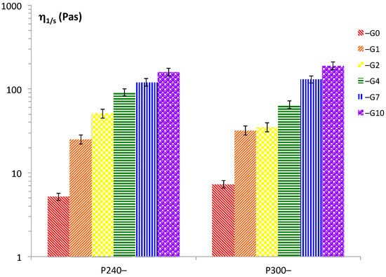 The shear flow experiments evidenced the viscosity profiles of the various systems; the values of the viscosities measured at 1 s−1 are reported in Figure 2. Upon increasing the concentrations of P90G and GeCH, the viscosities of the resulting gels become higher. However, the observed increase in viscosity could not be due only to a concentration effect (water coordination) or to a simple additive effect of the viscosities of the two systems. Indeed, mixing GeCH with P90G led to more than an additive increase in viscosities. Note that the GeCH suspensions at 1, 2, 4, 7, and 10 mg/mL showed values of 0.003, 0.005, 0.01, 1.32, and 12 Pa⋅s at 1 s−1, respectively. Therefore, looking at the values reported in Figure 1 and Figure 2, inter-particle interactions and modification of the liposome dimensions had an important effect in the P90G/GeCH viscosities, thus confirming the proposed model.